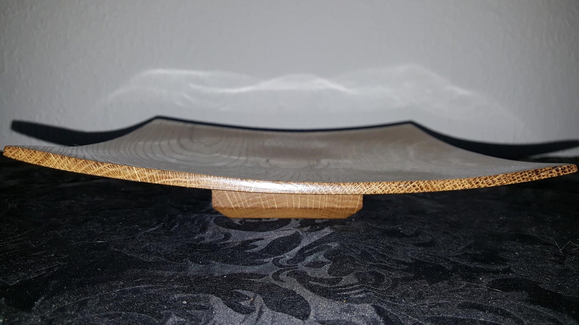 Die Schale wurde aus einem über 70 Jahre alten Stück Eiche gedrechselt, danach bis 1200er Korn geschliffen, poliert und mit Tungbaumöl mehrfach behandelt.