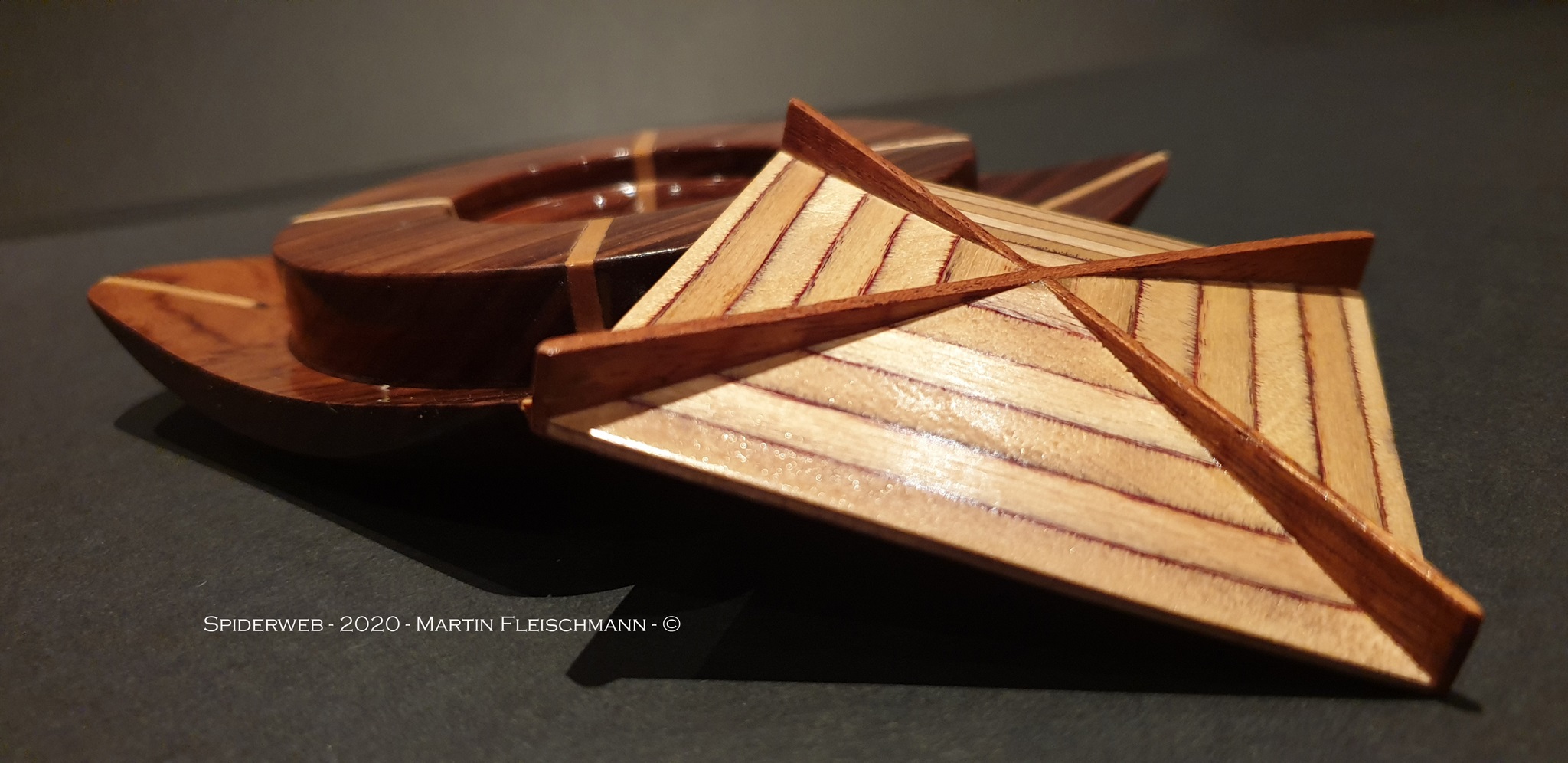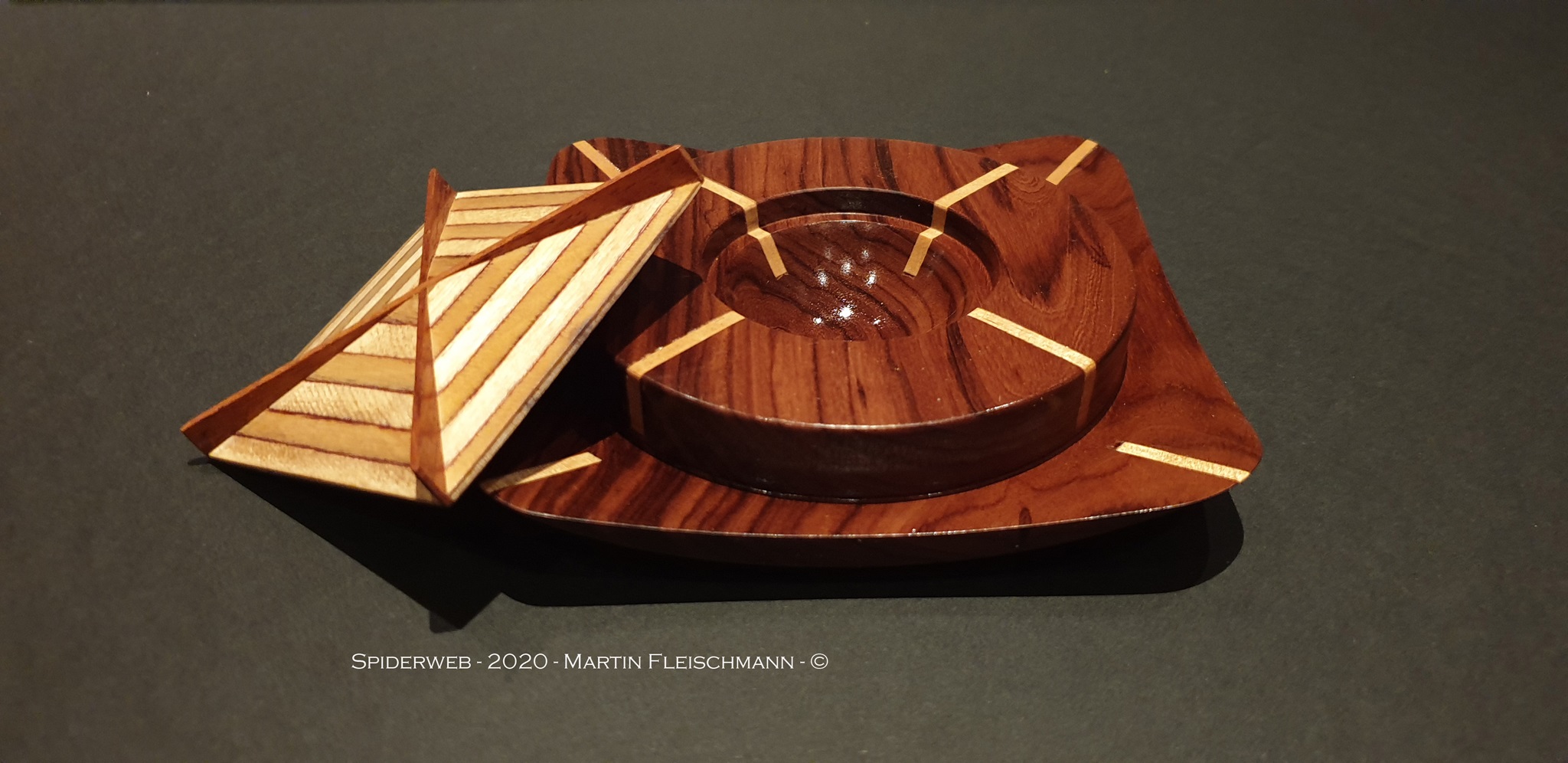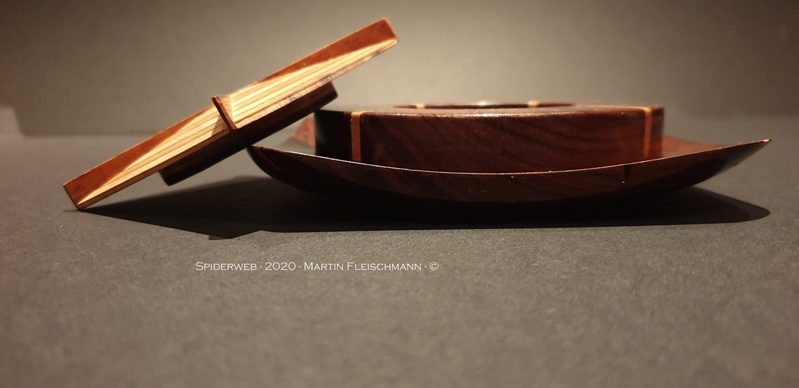Nach einigen Überlegungen entschied ich mich, eine kleine Schale mit Deckel im japanischen Stil herzustellen, sie sollte feine Linien haben und filigran im Aussehen sein. Ebenso wollte ich die Gegensätze von rund und eckig betonen, was sich durch die Verwendung von verschiedenen Hölzern noch besser hervorheben lässt.