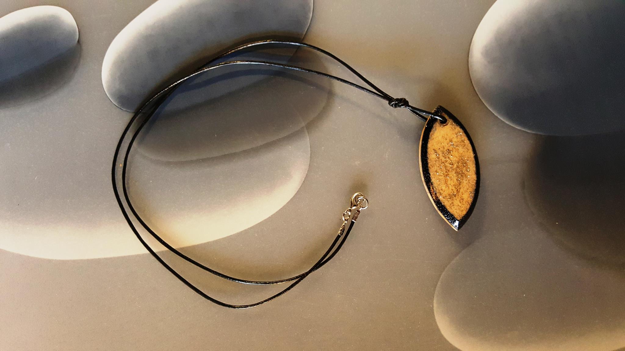 Anhänger aus Birke mit geschwärztem Rand und Silberstaub, mehrfach lackiert.