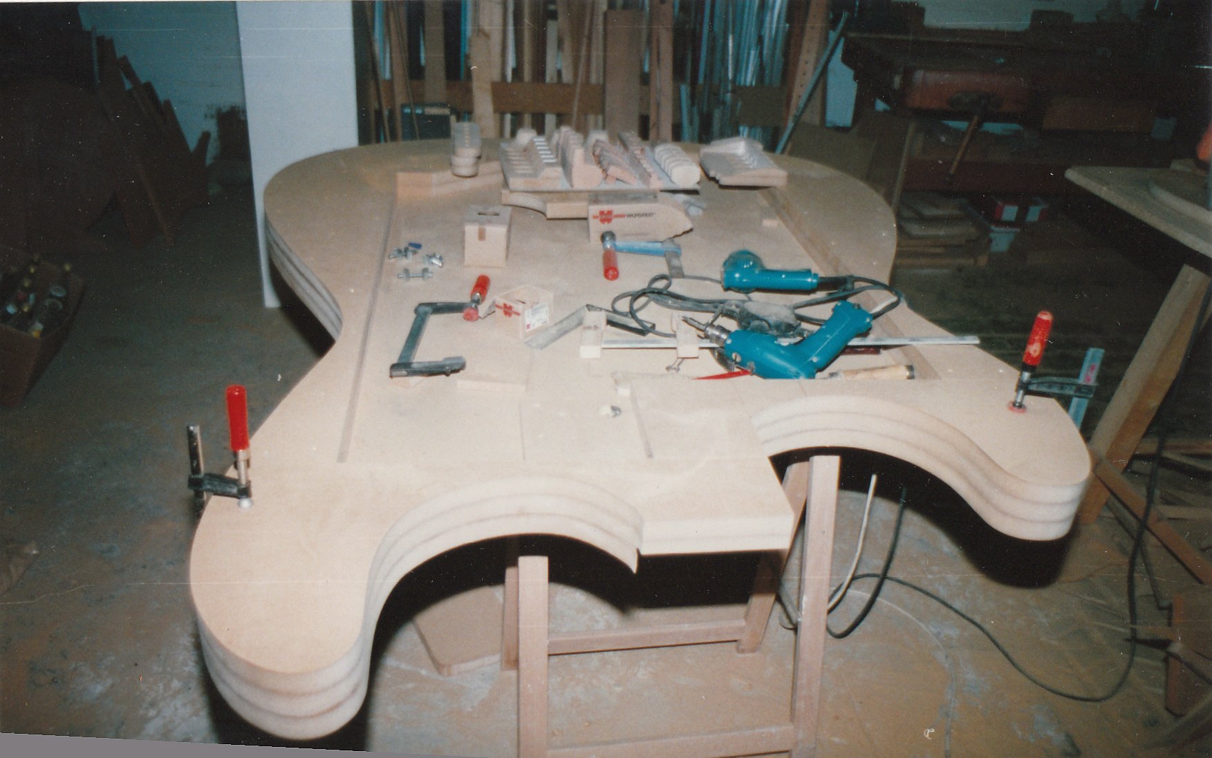 Für den sicheren Transport wurden dann noch drei verschiedene Koffer aus Holz angefertigt, einer für den Korpus, einer für den Hals und einer für das Regal.