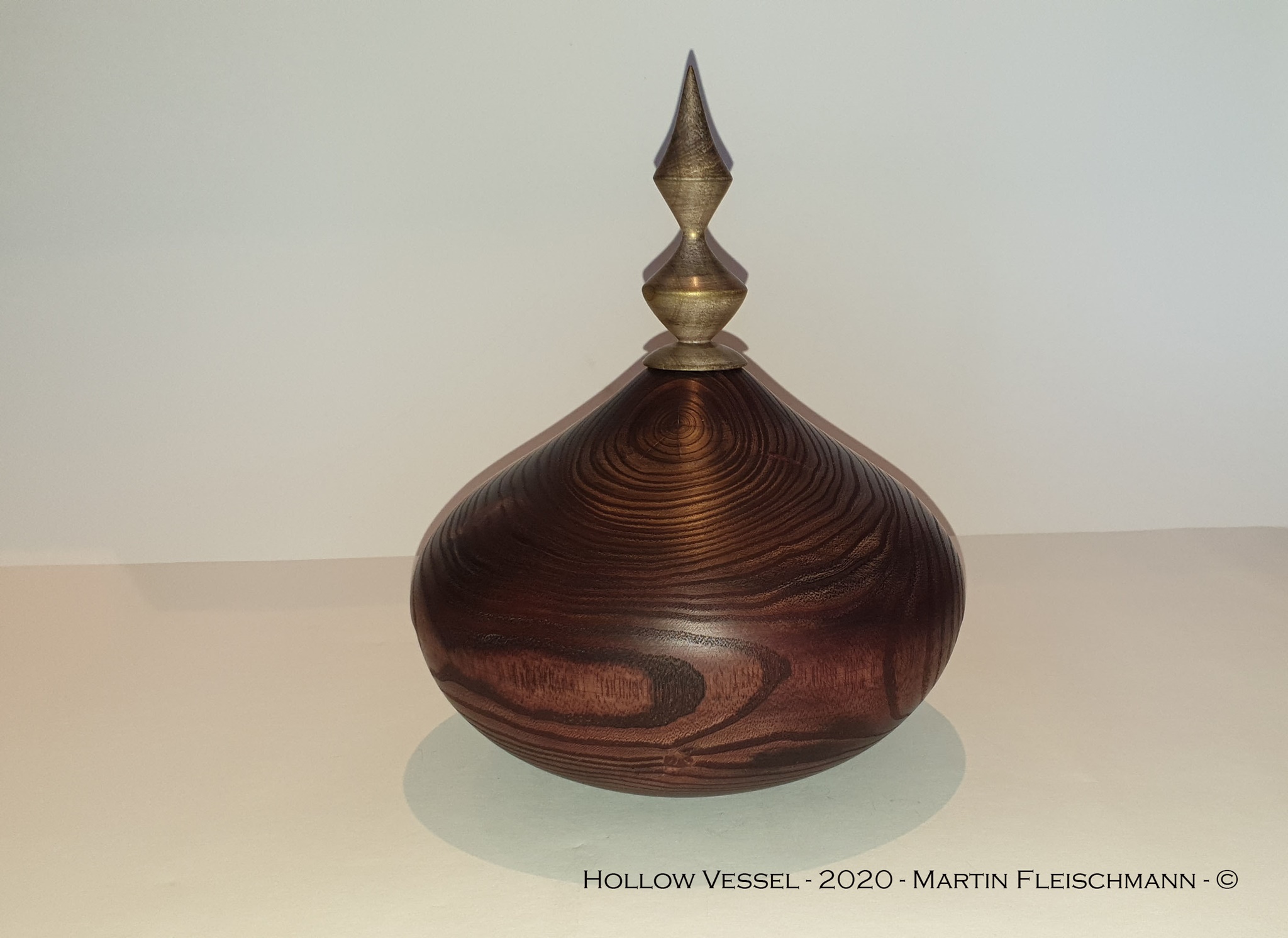 Das Gefäß hat eine Höhe von 140 mm und einen Durchmesser von 180 mm und eine Wandstärke von ca. 2 mm, die Öffnung hat einen Durchmesser von 30 mm. Die Oberfläche habe ich bis 1200 er Körnung geschliffen und mit schwarzer und roter Beize bearbeitet.