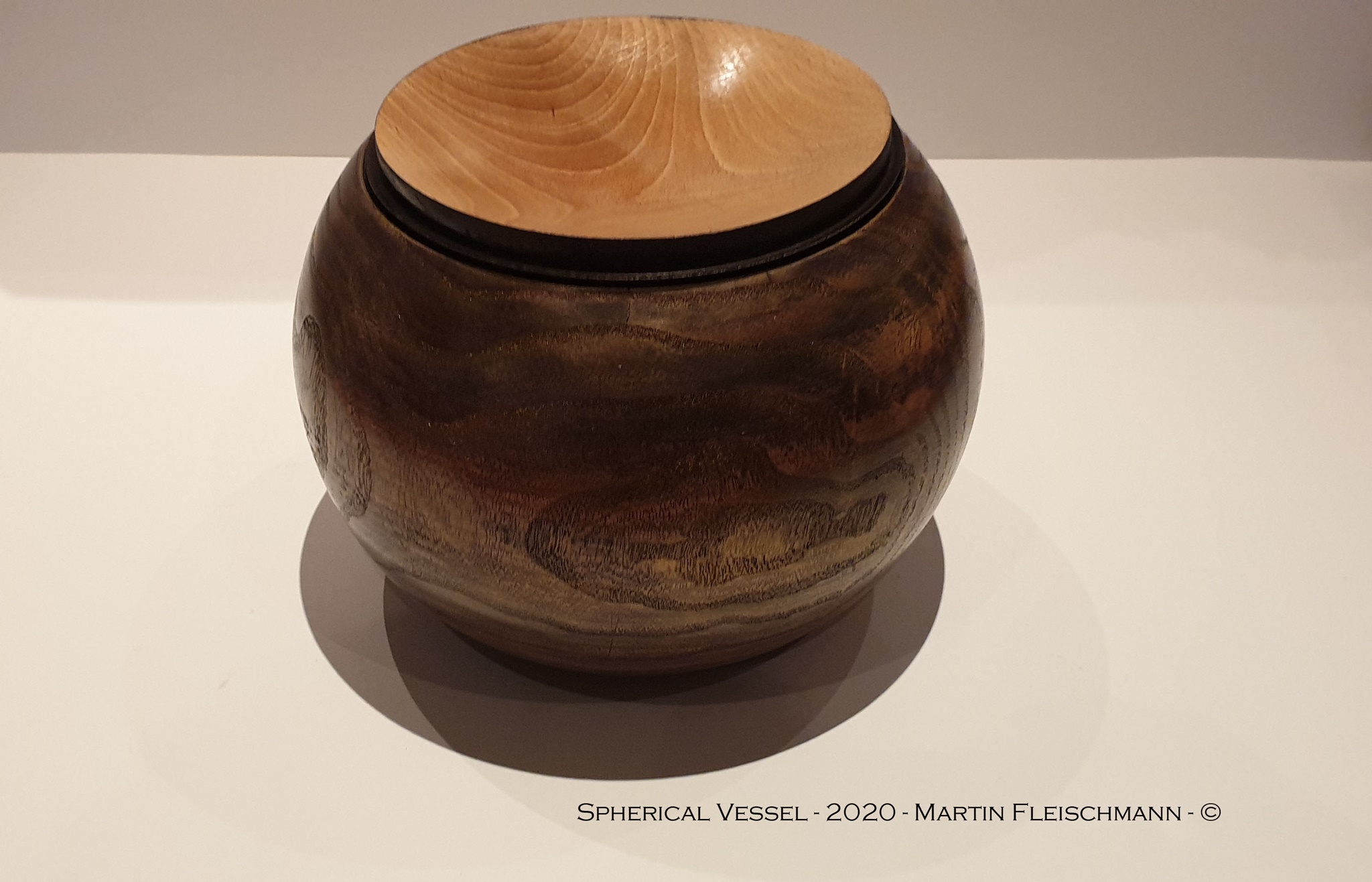 Das Gefäß hat eine Höhe von 205 mm und einen Durchmesser von 200 mm und eine Wandstärke von ca. 5 mm, die Öffnung hat einen Durchmesser von 130 mm. Die Oberfläche habe ich bis 1000 er Körnung geschliffen und mit schwarzer Beize und Goldpigmentfarbe bearbeitet.