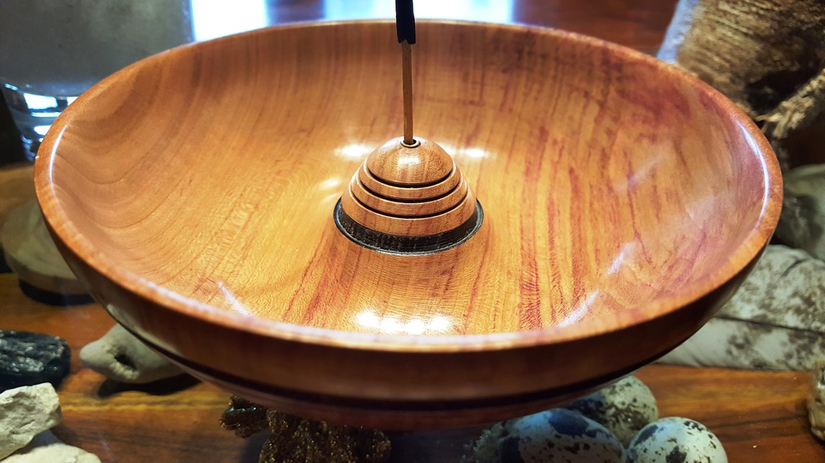 Die Schale für Räucherstäbchen habe ich aus Zwetschge gedrechselt. Die Messinghülse in der Mitte ist 25 mm in das Holz eingelassen und sorgt für einen sicheren Halt der Räucherstäbchen. Die wunderschöne Maserung der Zwetschge wurde durch die Behandlung mit Carnaubawachs und durch polieren noch besser zur Geltung gebracht.